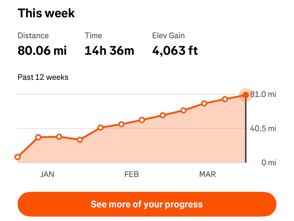 Enjoying a down week and some warmer weather in the week ahead before we crank back up and start making our way toward 100 mile weeks. I get to do this and I’m thankful every day. 200 miles is already feeling more in reach than it was a few weeks ago.