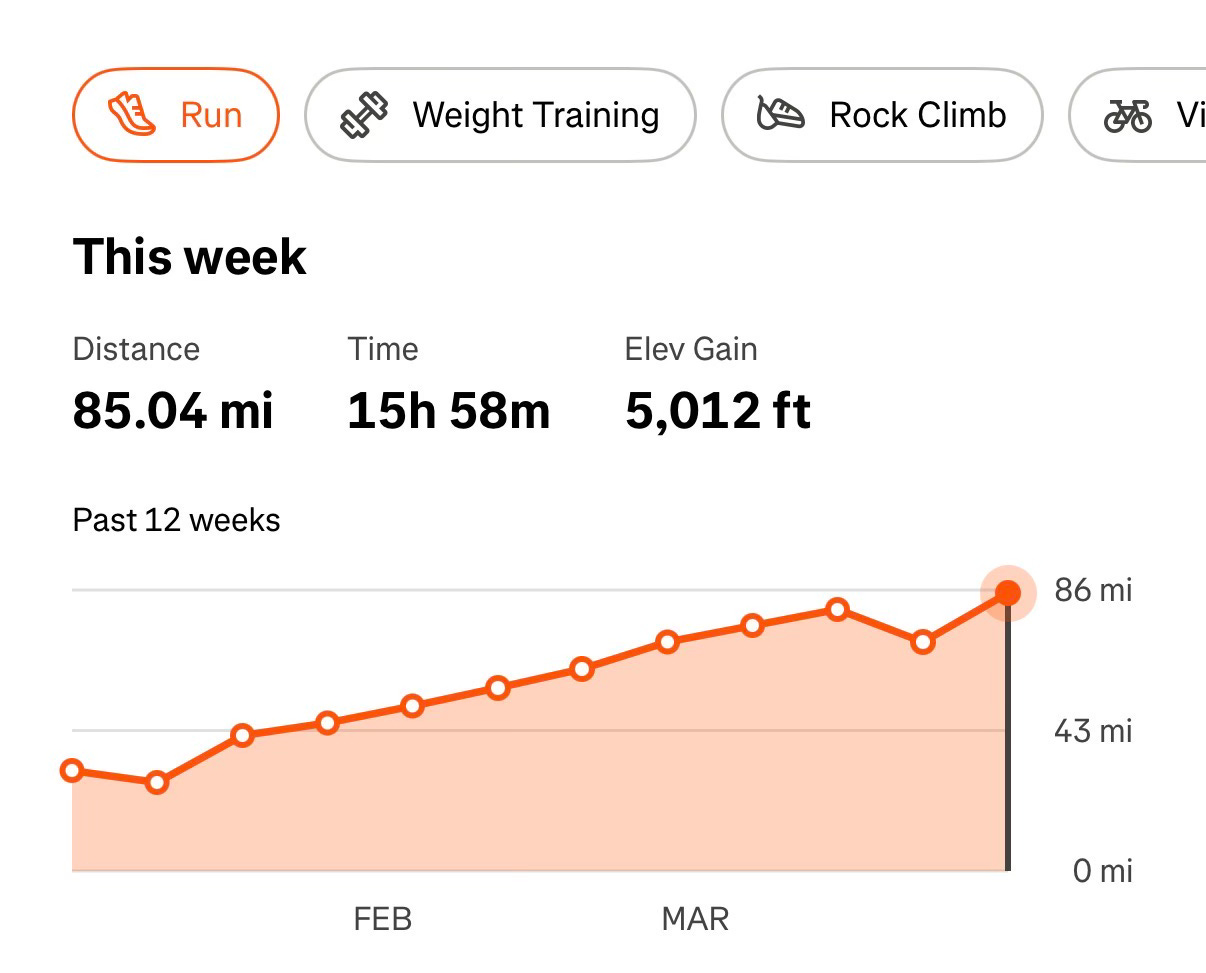 The next two weeks feel bigger. The mileage is only another 5 mile bump, but I’m living at 90 miles each week, with the second having a pretty beefy back to back. This coming week we both move into a new house and spend a few days with the in-laws for Easter, so getting ugly miles in will be the theme of the week. The following, with a bigger back to back effort, I’ll hopefully get into the lower alpine finally and have two big days out as we start to eyeball 100 miles per week and beyond.